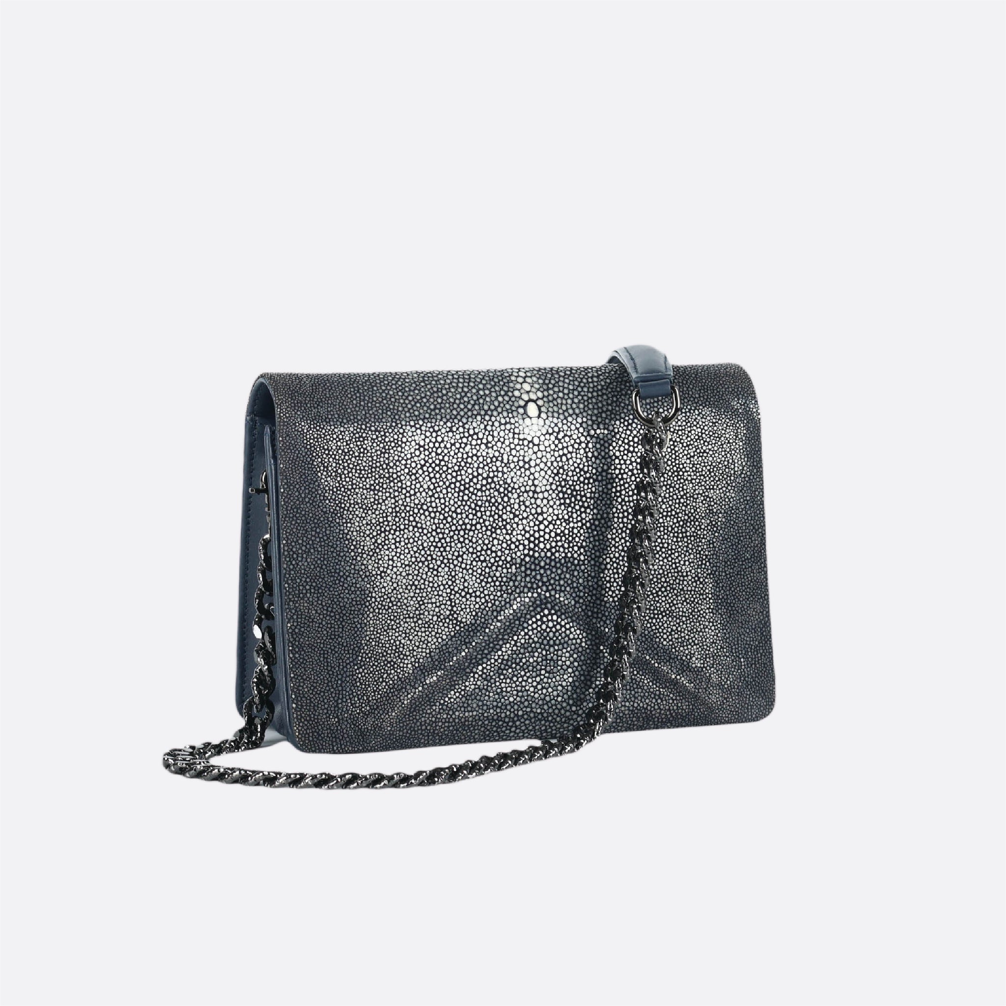 With signage triangle embossed. A full-length luxurious stingray front-side and back-side, Fabric lining, And a optional black rhodium chain strap. Interior name card holder and zip pocket. Magnetic closure. A touch of glam and simply perfect piece for dressing up any outfit.